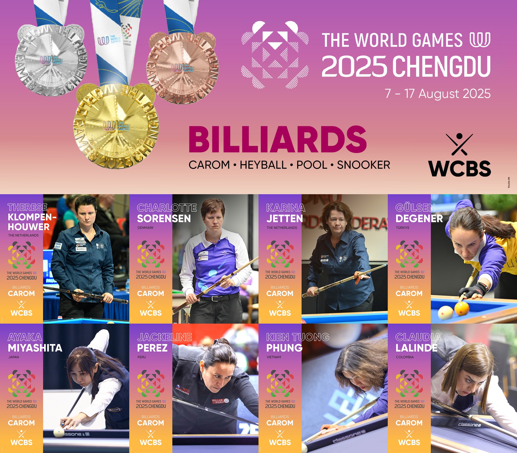 CHENGDU – Van 6 tot 17 augustus 2025 gaan in Chengdu, China (Civil Aviation Flight University) de World Games 2025 van start, de Spelen voor niet-Olympische sporten. Voor de 7e editie van de World Games met biljarten (de 12e editie totaal), met 61 disciplines in 35 sporten die niet tot de Olympische sporten behoren, reizen 12 heren uit de driebanden wereldtop (waaronder namens TeamNL Dick Jaspers) en 8 dames uit de driebanden wereldtop (waaronder namens TeamNL Therèse Klompenhouwer en Karina Jetten) af naar China. Een vierde deelneemster namens TeamNL is Tamara Rademakers in het onderdeel heyball, het snelgroeiende voormalige chinese pool/chinese 8-ball. De biljarters (driebanden, snooker, pool en heyball) hebben op zaterdag 9 augustus een trainingsdag en spelen de competitie van zondag 10 tot en met donderdag 14 augustus.