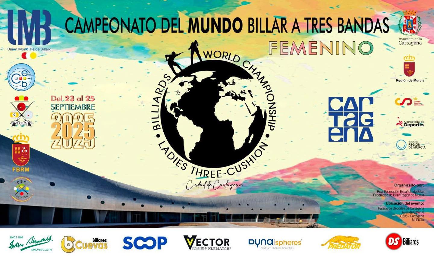 CARTAGENA – De Spaanse stad Cartagena in de regio van Murcia is de organisator deze week van twee wereldkampioenschappen driebanden. De dames starten dinsdag (23 september) met hun toernooi, dat drie dagen duurt, daarna komen de junioren in de arena in het gevecht om de wereldtitel. De locatie is het Palacio de Deportes in Cartagena. Het veld bestaat uit acht groepen van 3 speelsters van wie de beste twee uit elke groep naar de beste zestien gaan voor de knock-outs. Charlotte Sörensen verdedigt de wereldtitel die ze behaalde in Blois, Frankrijk. De Spaanse Estela Cardoso speelt in haar geboortestad. Mr. Jose Carrasco, bekend als jeugdtrainer in Spanje, is toernooidirecteur.