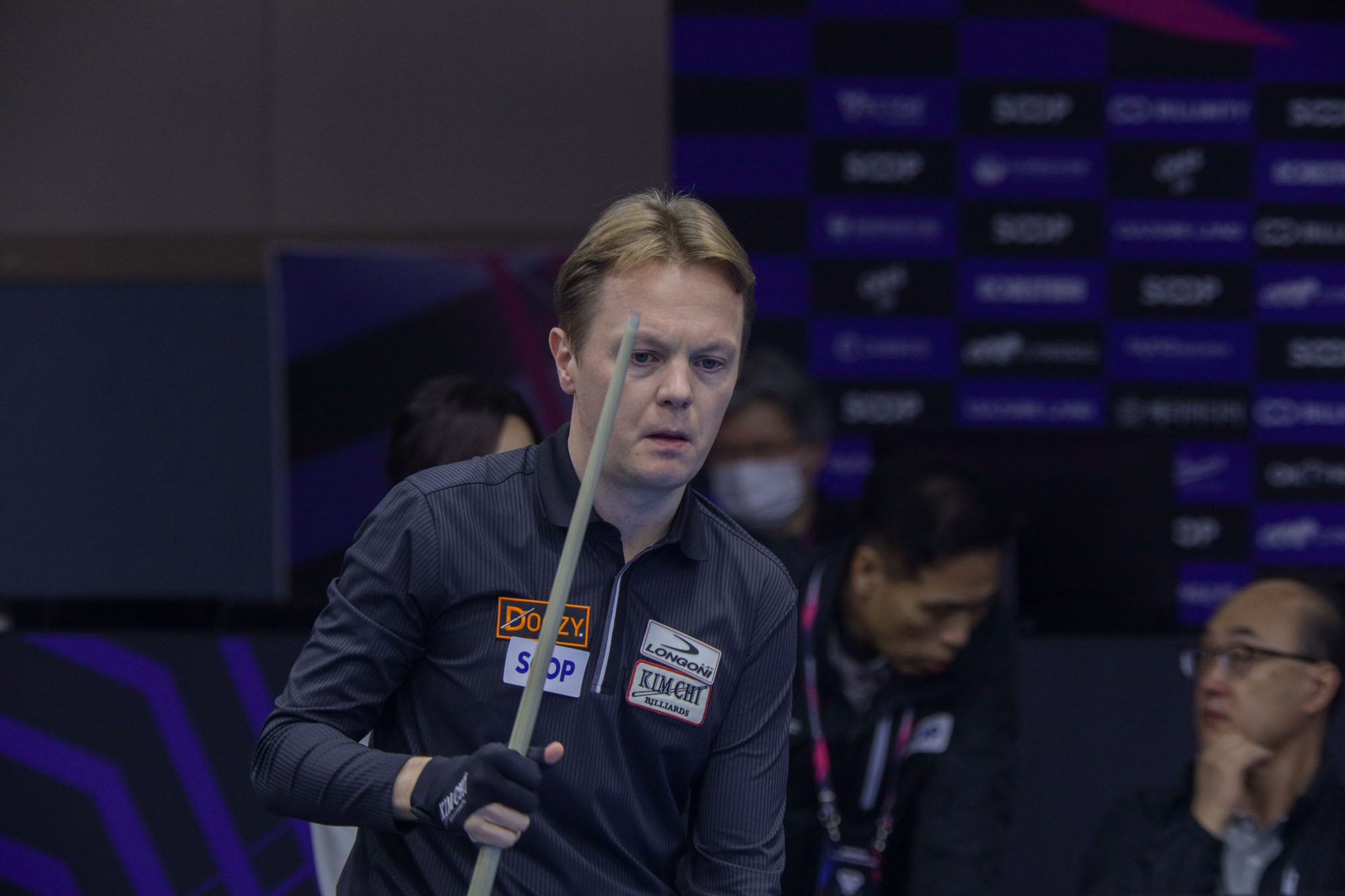 De spanning blijft er tot het einde in, omdat Marco Zanetti in zijn laatste partij tegen Bong Jo Hwang aanloopt (40-). De Koreaan, die al een prima moyenne had, komt door die winst aan kop van de groep. Berkay Karakurt heeft nog een klein kansje om Zanetti te bedreigen in moyenne, maar wordt gevonnist door de Vietnamees Thanh Tien Le, die een 14 scoort en winst in die laatste groepswedstrijd. Daardoor gaan Hwang en Zanetti naar de knock-outs.