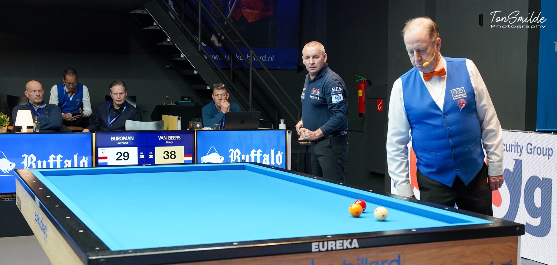 De partij van die eerste dag was die tussen Jeffrey Jorissen en Jean Paul de Bruijn, gewonnen door de ex-Hagenaar met een beslissende 11 in de voorlaatste beurt: 40-34 in 23 beurten. De eerste winnaars treffen elkaar vandaag, donderdag, in de tweede sessies van de groepen. Jeffrey Jorissen speelt tegen Adrie Demming voor een haast zekere plaatsing, Dick Jaspers tegen Sam van Etten, Glenn Hofman-Raimond Burgman en Jean van Erp-Dave Christiani.