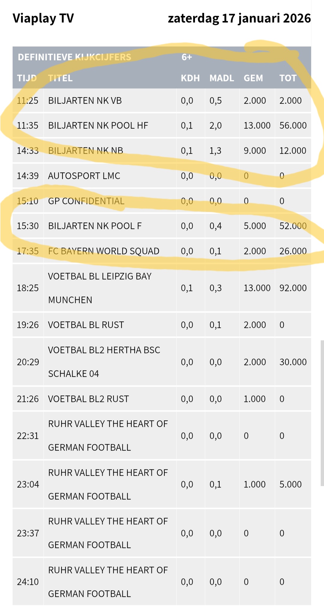 Voor zenders zeker net zo belangrijk: het marktaandeel. Hier scoorden vooral de ochtend/vroege-middag pool uitzendingen op zaterdag goed. Hadden vrijwel alle uitzendingen op Viaplay TV een marktaandeel tussen 0.0 en 0.3% (de genoemde voetbalwedstrijd), bij de halve finales van het poolen was dit 2.0% en bij de nabeschouwing ervan 1.3%. Cijfers waar een zender uiterst vrolijk van wordt – en wij dus ook. Voor de twee driebandenuitzendingen was dit soortgelijk: geen enkel programma van de dag boven 0.2% marktaandeel, behalve de driebanden uitzendingen: de halve finales 0.9%, de finale 0.8%. Prima, dus!