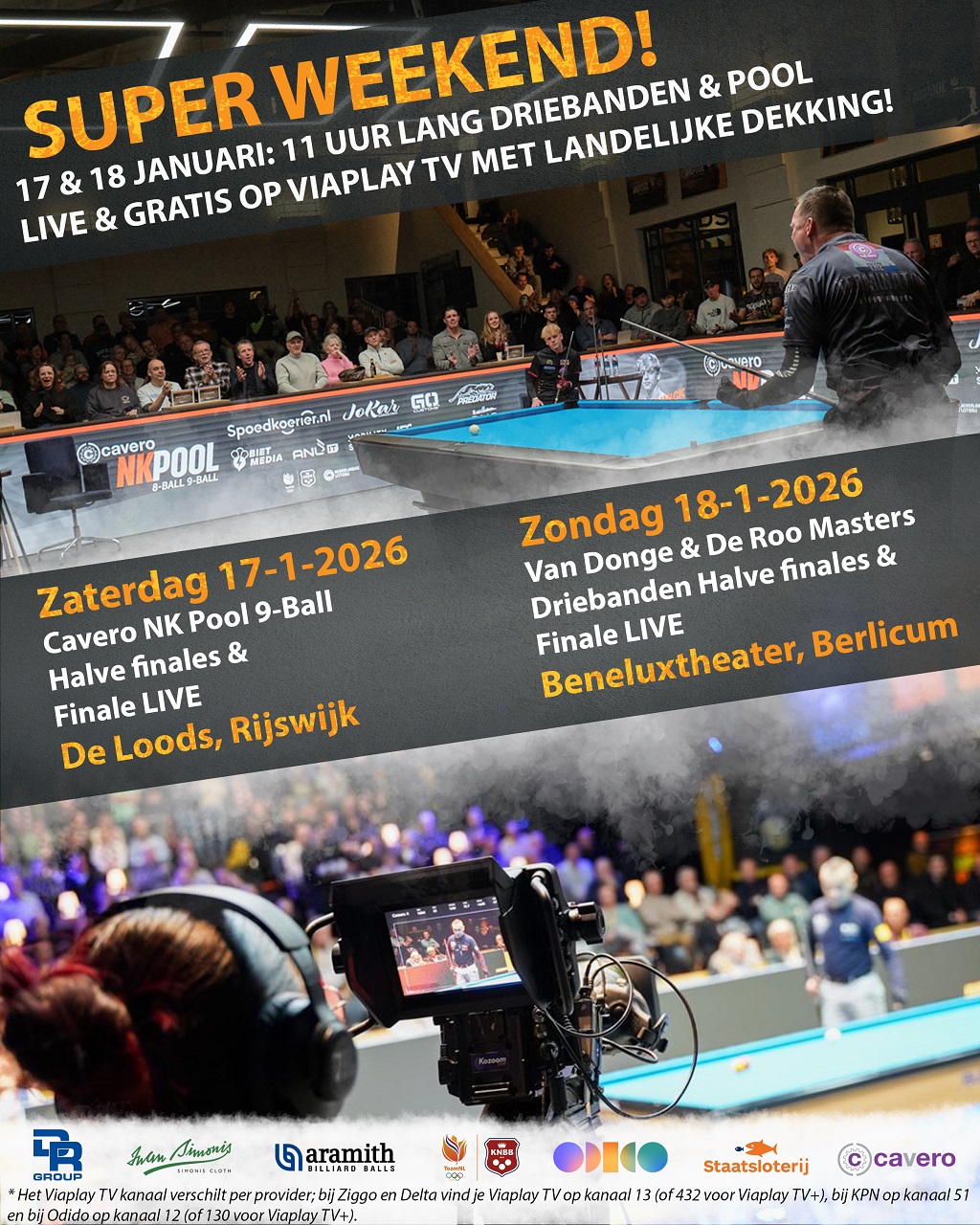 “Sinds enige tijd werken wij zeer plezierig samen met Viaplay, en het weekend van 17 en 18 januari 2026 is het voorlopige hoogtepunt van deze samenwerking. Ditmaal zijn niet alleen de finales van het Cavero NK Pool en de Van Donge & De Roo NK Masters Driebanden live te zien op het open net van Viaplay TV, maar ook de halve finales van beide events. Kortom, de volledige slotdag van het jaarlijkse hoogtepunt van het pool en dan het driebanden, alles in één weekend, live te zien dus voor iedereen in Nederland. Met recht een superweekend – een unicum voor het Nederlandse biljart en pool.”