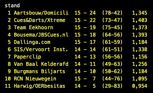 Aartsbouw blijft koploper met twee punten voorsprong op Cues&Darts ondanks de gelijke score bij SIS. Daar gaf Jean van Erp het de voorzet met winst tegen Merckx (40-28 in 24 met een slotserie van 9). Raymund Swertz was ook een uitstekende winnaar tegen Barry van Beers (40-22 in 21). Voor Aartsbouw trokken Turgay Orak en Allan Schröder de zaken recht met winst op Raimond Burgman en Harry van de Ven.