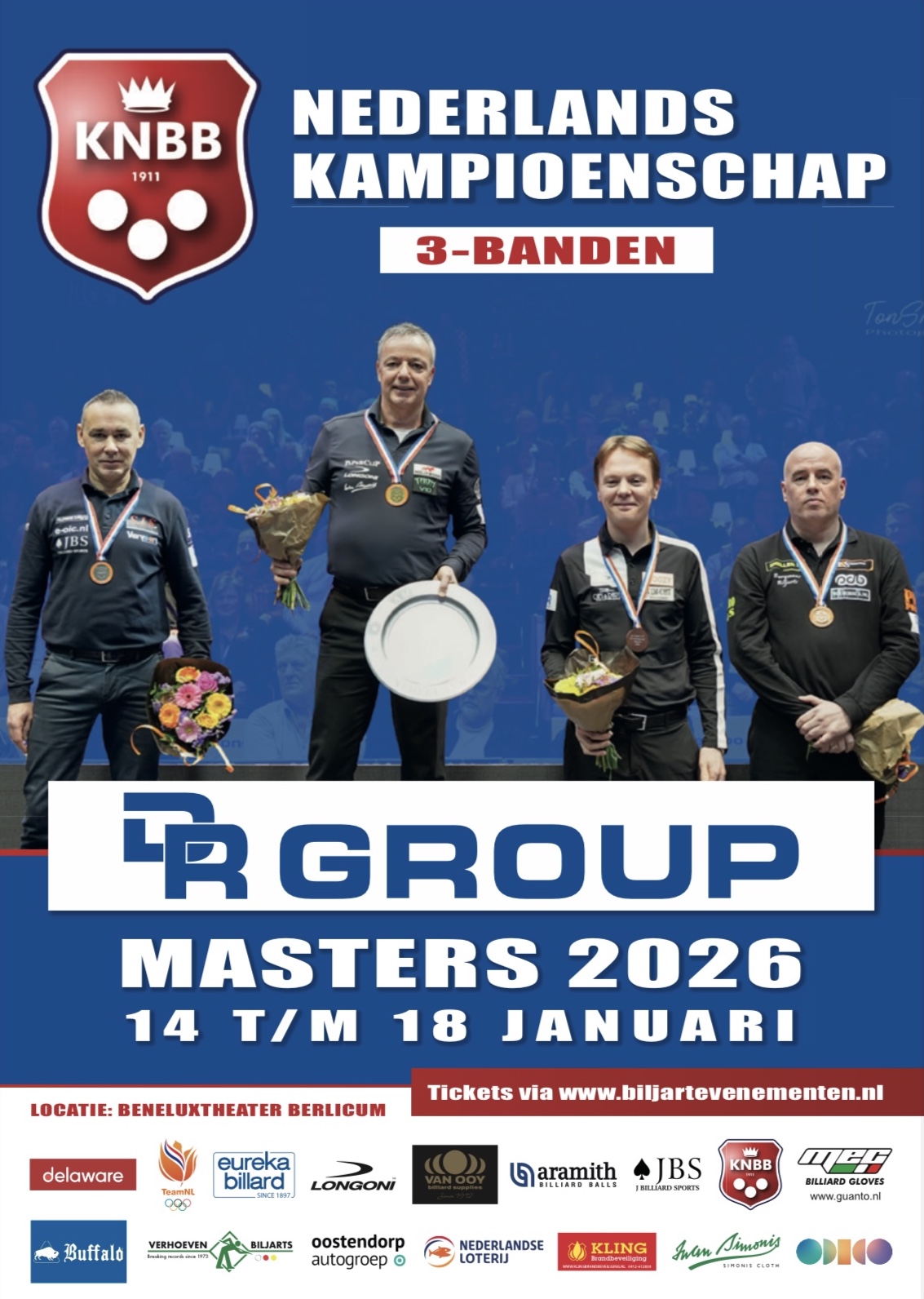 KNBB 'VAN DONGE & DE ROO' MASTERS 2026 (NK DRIEBANDEN)Data: 14 januari t/m 18 januari 2026 Locatie: Benelux Theater, Kerkwijk 61, 5258 KB Berlicum Organisatie: St. B.E.N. in de samenwerking met de KNBB - sectie Driebanden